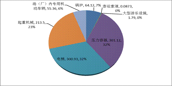截至2013年底,全國特種設(shè)備總量達(dá)936.91萬臺,比2012年上升14.02%;其中:鍋爐64.12萬臺,壓力容器301.12萬臺,電梯300.93萬臺,起重機(jī)械213.50萬臺,場(廠)內(nèi)專用機(jī)動車輛55.36萬輛,大型游樂設(shè)施1.79萬臺(套),客運索道873條,氣瓶14387萬只,壓力管道89.83萬公里。