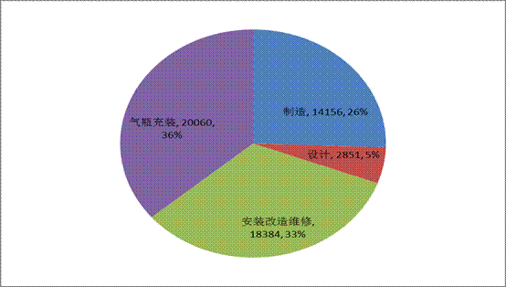 截至2013年底,全國共有特種設(shè)備生產(chǎn)(含設(shè)計、制造、安裝、改造、維修、氣體充裝)單位55451家,持有許可證64027張。