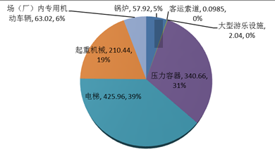 截至2015年底,全國特種設(shè)備總量達1100.13萬臺,比2014年底上升6.14%。其中:鍋爐57.92萬臺、壓力容器340.66萬臺、電梯425.96萬臺、起重機械210.44萬臺、客運索道985條、大型游樂設(shè)施2.04萬臺、場(廠)內(nèi)機動車輛63.02萬臺。另有:氣瓶13698萬只、壓力管道43.63萬公里。