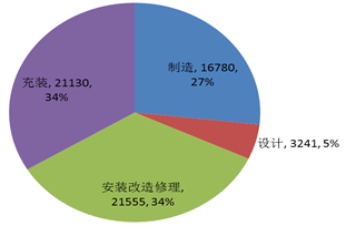 截至2015年底,全國共有特種設(shè)備生產(chǎn)(含設(shè)計、制造、安裝、改造、修理、氣體充裝)單位62706家,持有許可證68804張,其中:設(shè)計單位3241家,制造單位16780家,安裝改造修理單位21555家,移動式壓力容器及氣瓶充裝單位21130家。