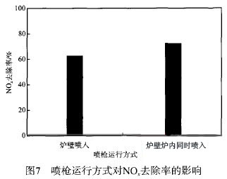 氨水與煙氣的充分、均勻混合是保證高NOx去除率的又一技術關鍵。在氨水質量分數為13.O%、噴入點溫度為894℃、n(NH3):n(NOx)為1.2、霧化壓力為0.35 MPa的條件下,分別采用爐壁噴入和爐壁爐內同時噴人兩種方式噴入氨水,噴槍運行方式對N0x去除率的影響見圖7。由圖7可見,當噴槍采用爐壁爐內同時噴入的運行方式時,NOx去除率明顯提高。這是因為分解爐的直徑較大,采用爐壁爐內同時噴人的運行方式可以使氨水與煙氣接觸得更加充分、均勻。因此,在水泥窯SNCR脫硝工藝運行時,應根據不同爐型的結構特點,合理布置噴射點位,調整噴槍運行方式,以實現氨水與煙氣的充分、均勻混合。